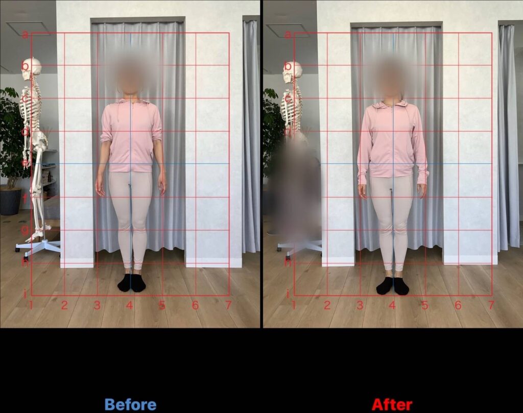 💡 写真で比べてみると、肩や骨盤の位置が整っただけで上半身の印象が全然違うのが分かります◎