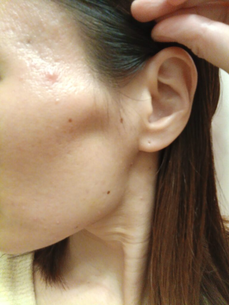 左は、こめかみ付近やフェイスライン付近に吹き出物ポツリです(クレーターが酷い… (´;ω;`))